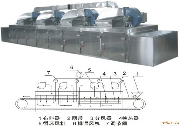 DW系列多層帶式干燥機是成批生產用的連續式干燥設備,用于透氣性較好的片狀、條狀、顆粒狀物料的干燥,對于脫水蔬菜、催化劑、中藥飲片等類含水率高、而溫度不允許高的物料尤為合適;該系列干燥機具有干燥速度快、蒸發強度高、產品質量好的優點,對脫水濾餅狀的膏狀物料,需經造粒或制成條狀后方可干燥。