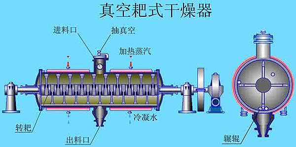 真空耙式干燥機是一種新穎臥室間歇式真空干燥設備,濕物料經傳導蒸發,帶有刮板攪拌器不斷清除熱面上的物料,并在容器內推移形成循環流,水份蒸發后由真空泵抽出。