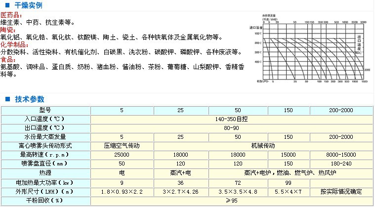 干燥速度快,料液經(jīng)霧化后表面積大大增加,在熱風氣流中,瞬間就可蒸發(fā)95%-98%的水份,完成干燥時間僅需數(shù)秒鐘,特別適用于熱敏性物料的干燥。所有產(chǎn)品具有良好的均勻度、流動性和溶解性,產(chǎn)品純度高,質量好。操作簡單穩(wěn)定,調節(jié)控制方便,容易實現(xiàn)自動化作業(yè)。生產(chǎn)過程簡化,適宜連續(xù)控制生產(chǎn)含濕量40%-90%的液體,一次干燥成粉,減少粉碎篩選等工序,操作環(huán)境衛(wèi)生條件優(yōu)越,能避免干燥過程中的粉塵飛揚。干燥回收率大于95%。